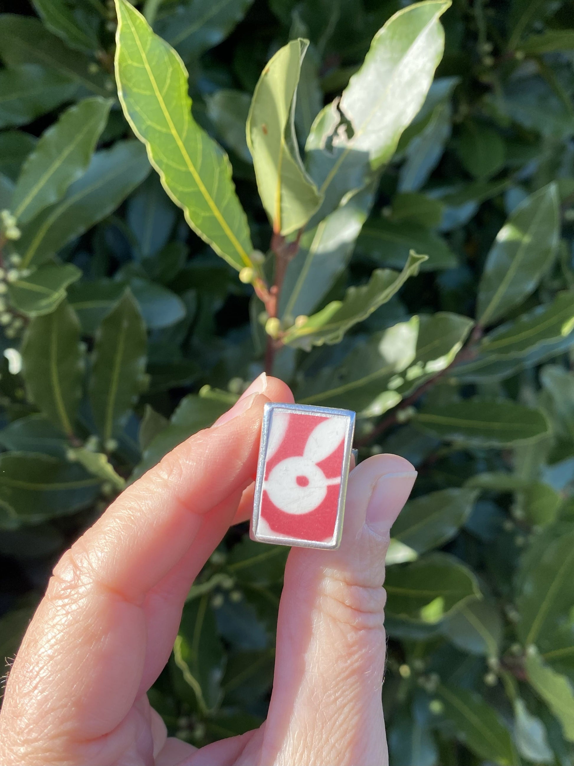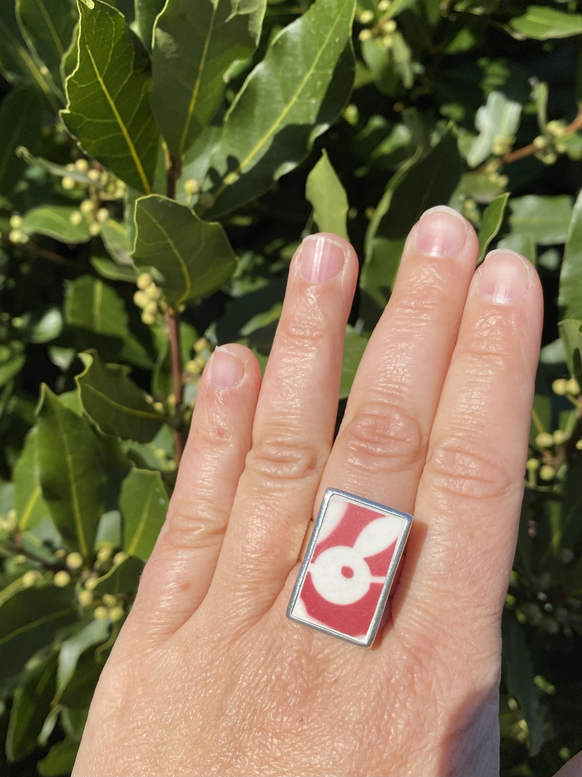 Découvrez cette bague, conçue à partir d’une assiette ancienne en faïence aux motifs géométriques rouge. Chaque pièce raconte une histoire, sublimée par un travail minutieux d’upcycling pour vous offrir un bijou raffiné et écoresponsable.